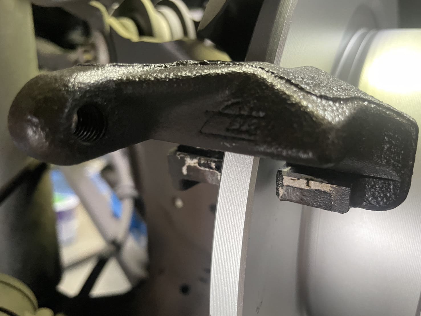 次に、ブレーキキャリパーを固定しているボルトを外し、古いブレーキパッドを取り外します。