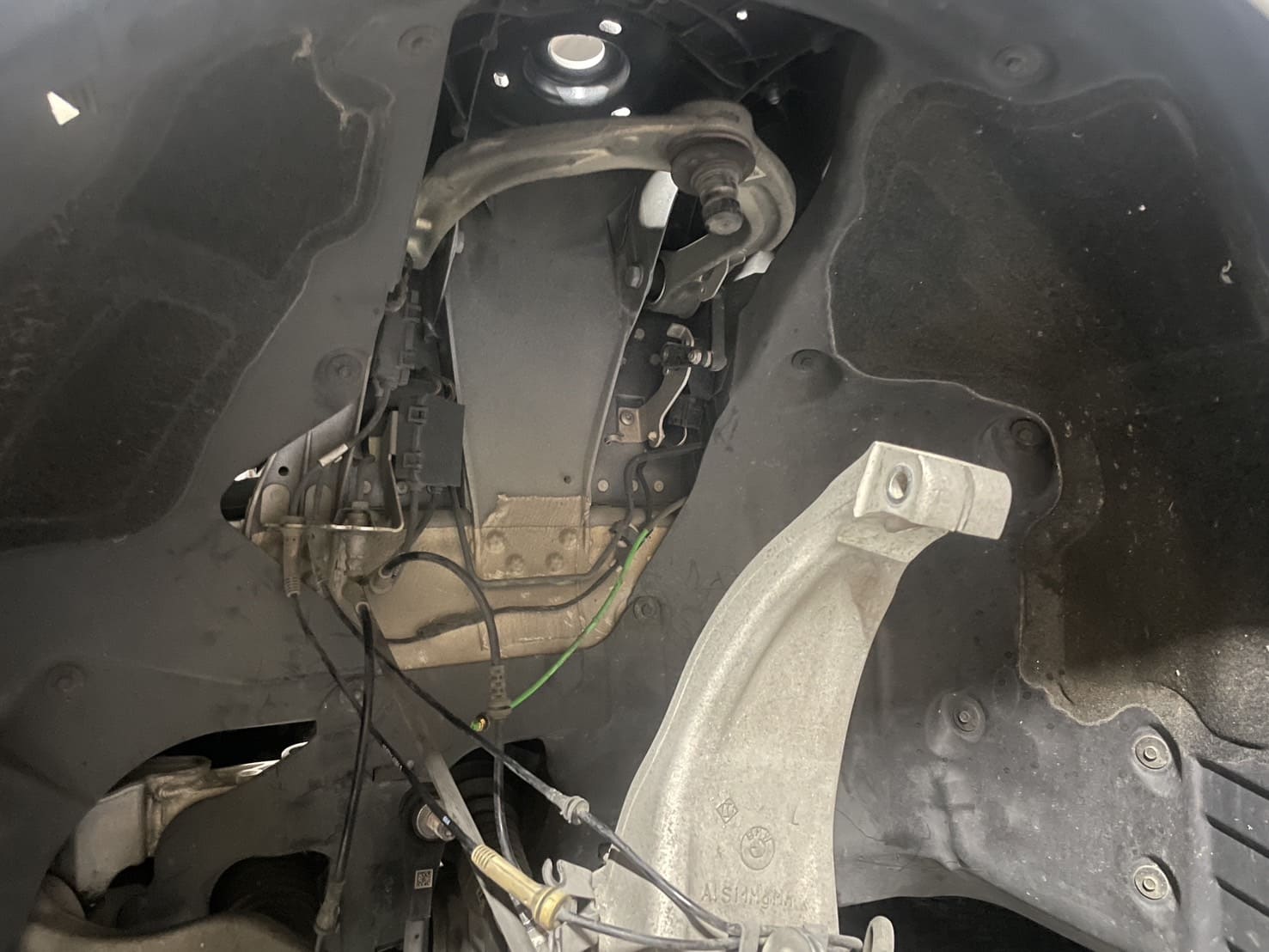 車両をリフトアップし、BMW専用工具を使用してタイヤ、ブレーキキャリパー、エアライン接続部を順序正しく取り外します。