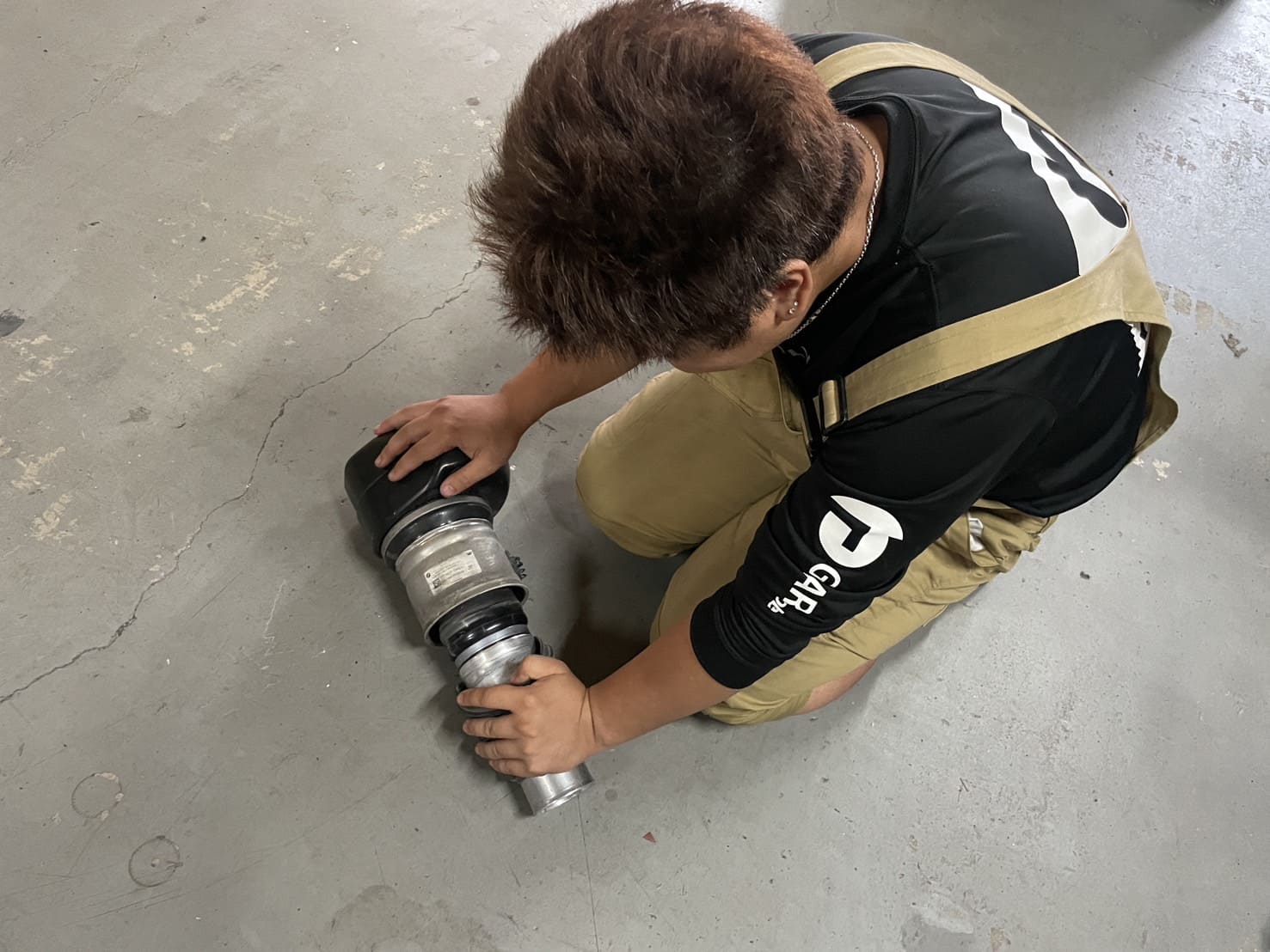 専用の作業台で、エアスプリング部分とショックアブソーバー部分を損傷させることなく安全に分離します。この工程では特に精密な技術が要求されます。